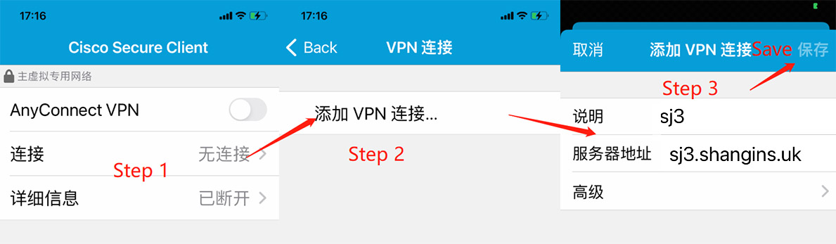 打开AnyConnect,点击 连接 – 添加VPN连接 (安卓用户点击右下角+号)– 说明填sj3,服务器地址填sj3.shangins.uk(福建地区用户填sh.shangins.uk:444),点击右上角保存(安卓用户点击完成)。