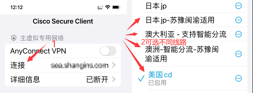 - 首次连接成功后,进入连接(如下图),可选择不同线路。