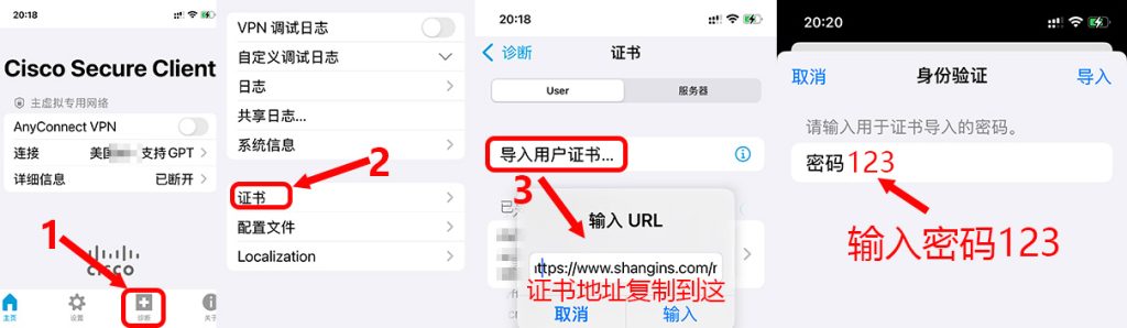 - 苹果手机/Mac电脑(苹果芯片)点诊断/Diagnosis – 证书 – 导入用户证书 – 复制粘贴证书地址(注意复制网址时确保末尾不含空格,否则闪退)- 输入 – 输入证书密码123