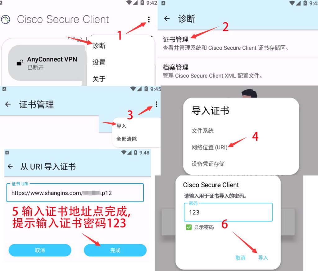 - 安卓手机点返回键,点击右上角三个点 – 诊断/Diagnostics- 证书管理 – 点击右上角三个点 导入 – 网络位置(URI) – 复制粘贴证书地址 – 完成 – 输入证书密码123