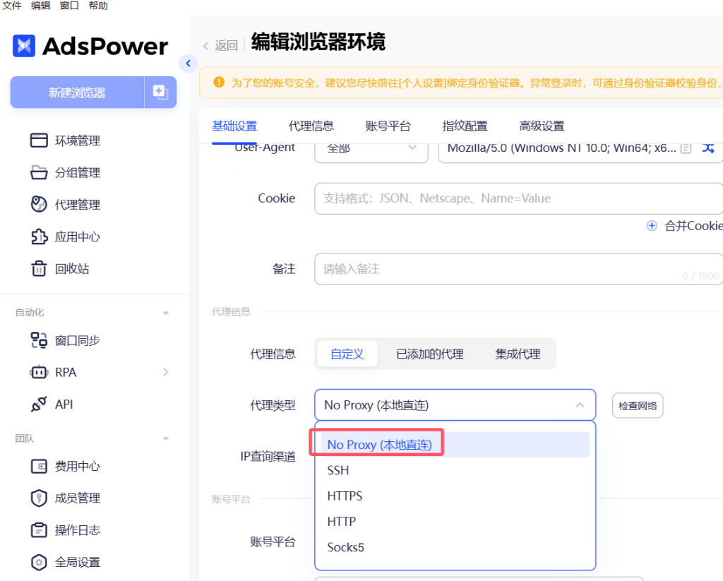 使用紫鸟、AdsPower指纹浏览器的用户请将浏览器的代理类型改为No Proxy(本地直连),否则无法上外网。